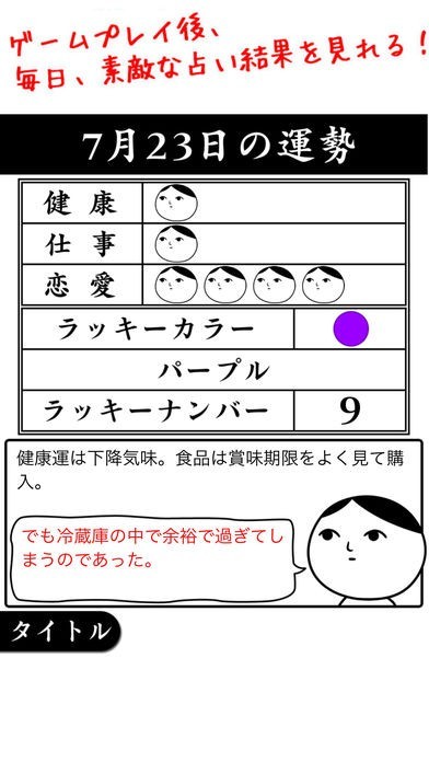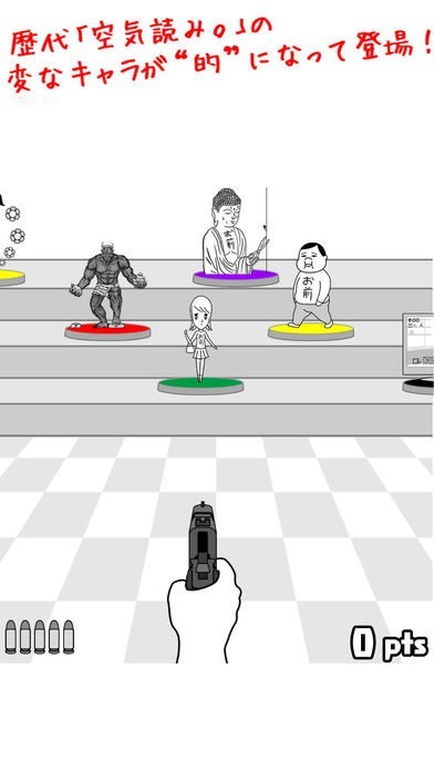 射的と占いが異色のコラボを果たした新感覚アプリです。射的の的はお馴染みのあのキャラクター「空気読み」のヘンテコキャラクターが登場します。左右から次々に現れるキャラを銃で撃っていくゲームです。よく狙って高得点を目指しましょう。撃ったキャラクター達はコレクションとして登録されていくので、全キャラクターのコンプリートを目指すというやりこみ要素もあります。そして生年月日を登録しておけば、射的を楽しんだ後に占いをすることができます。今日の運勢やラッキーカラーなどを占えるので、2度楽しむことができます。