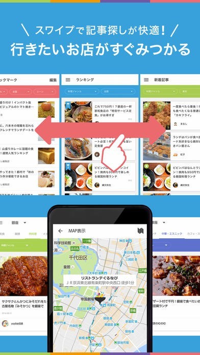 スワイプで楽々記事探しができる、使い勝手の良さも魅力のひとつです。お店探しが簡単、快適に、マップもついて、迷うこともありません。配信記事エリアは順次拡大中です。