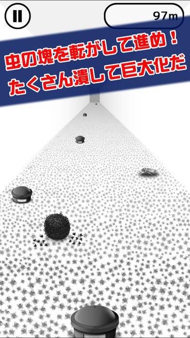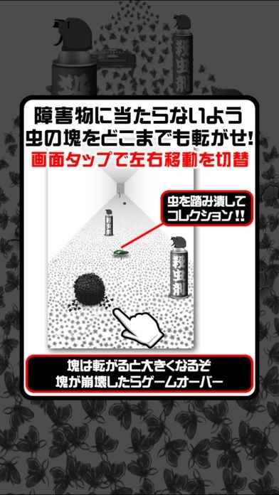 虫の塊は途中にある殺虫剤や左右の壁にぶつかってしまうと崩れて即ゲームオーバーになります。転がれば転がるほど虫の塊は大きくなっていくので、段々難易度が上がっていきます。
