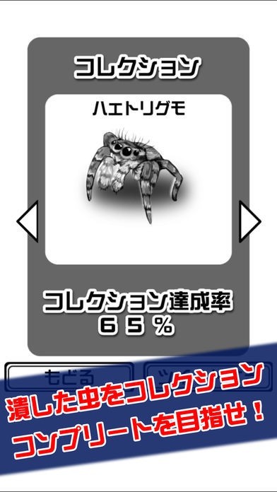 ゲーム中には様々な虫が登場し、その上を虫の塊が通って潰すとコレクションすることができます。コレクションはいつでも見ることができ、コレクション達成率も表示されるので100%目指してやりこめます。