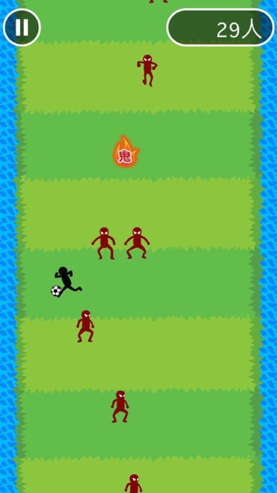 鬼ドリブルは、サッカーのドリブルです。画面をタッチして、サッカーボールを蹴りながら敵をどんどん抜いたりよけたりします。進行方向切替機能があります。画面をタッチする度に、進行方向の左右を切り替えていきます。難しい操作はないので、気軽にできスピード感が楽しめます。敵に当たってしまうとゲームオーバーになります。敵は限りなどたくさん出てきます。少しでも遅いと敵に当たってしまうので、すり抜けていくタイミングがポイントになり攻略につながります。ドリブルが続くと、鬼マークが出てきます。一定時間は燃えているので、無敵となりスピードアップします。敵を追い抜いた数が多いほどスコアが高くなり、爽快感が得られます。