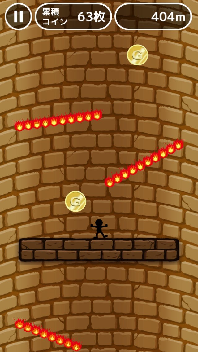 「エレベーター地獄」は、画面上に出てくる火の玉を避けながら進んでいくゲームアプリです。画面上をタップすると棒人間の方向を変えることができます。道中にはコインもありますので、取得すると特典があります。エレベーターから落ちたり、火の玉にあたると真っ黒焦げになってゲームオーバーになるので、注意が必要です。ゲームが終了すると何m進めたか記録がでます。コインを100枚使うと、復活して続けることも可能です。操作は難しいですが、やみつきになります。
