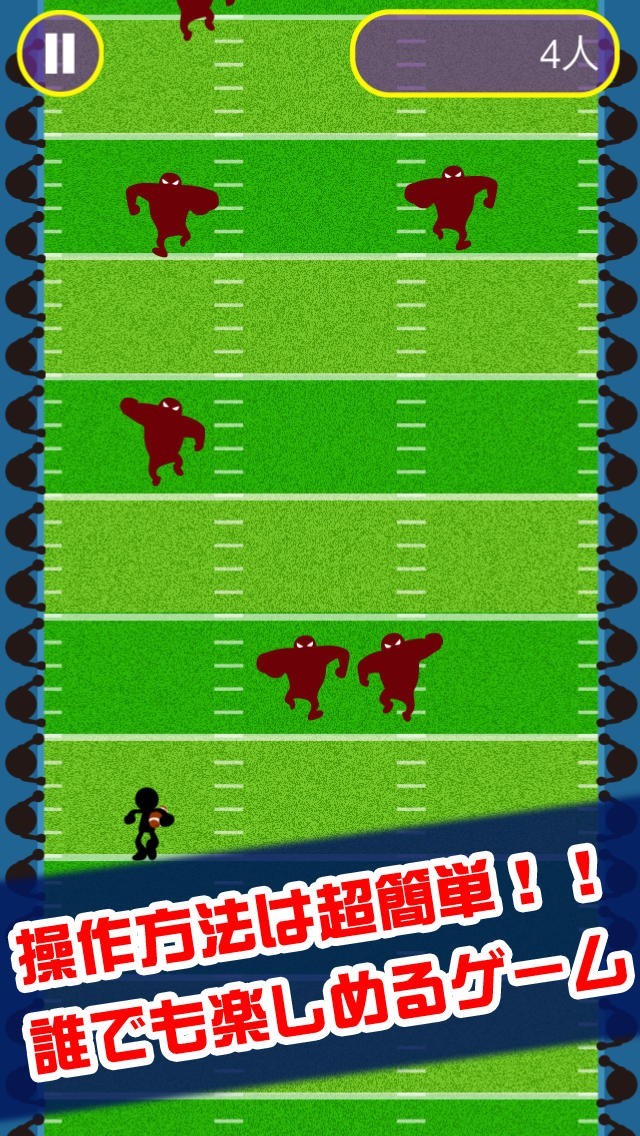 次々と迫りくる敵キャラクターのタックルを華麗にかわしながらできるだけ長い距離を突き進んでいく縦スクロールランゲームアプリが「タックルの嵐」です。画面の左右をタップすることで敵キャラクターのタックルをかわしながら進むことができるようになっているシンプルな操作性なので誰にでも簡単に楽しむことができるゲームです。敵キャラクターをかわすことでスコアを稼ぐことができるようになっていて、タックルを食らってしまうとゲームオーバーになります。