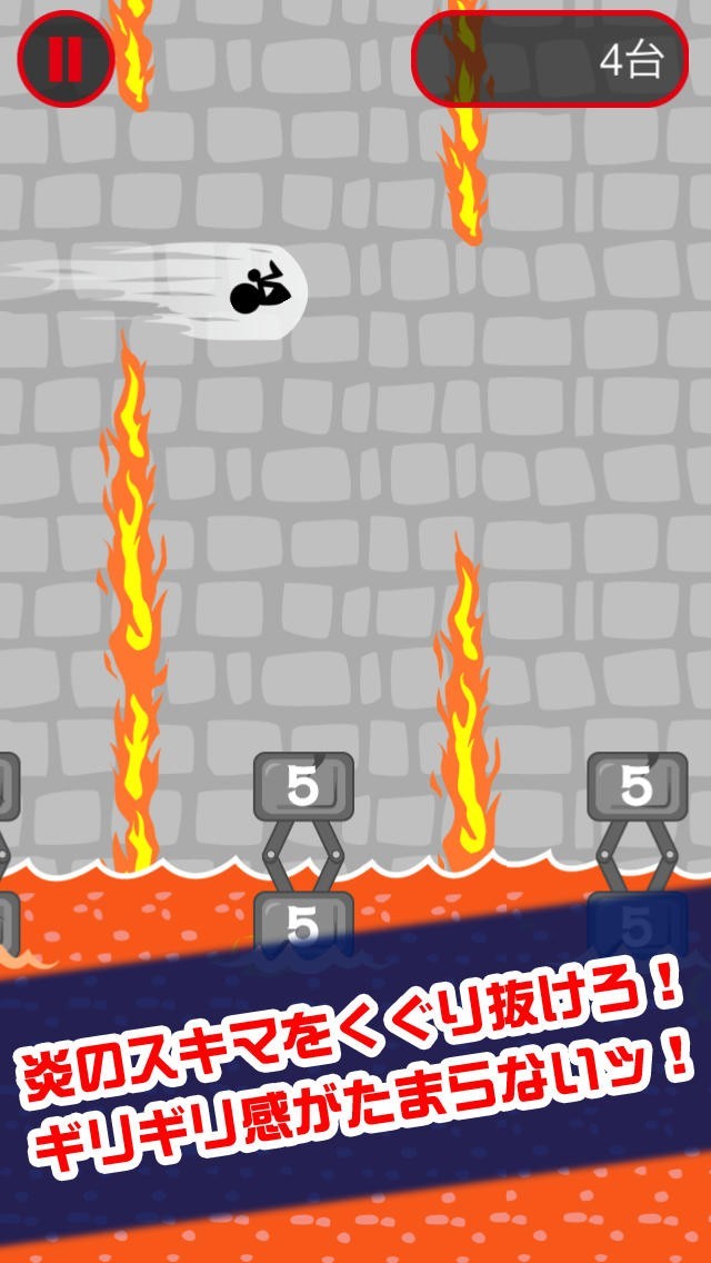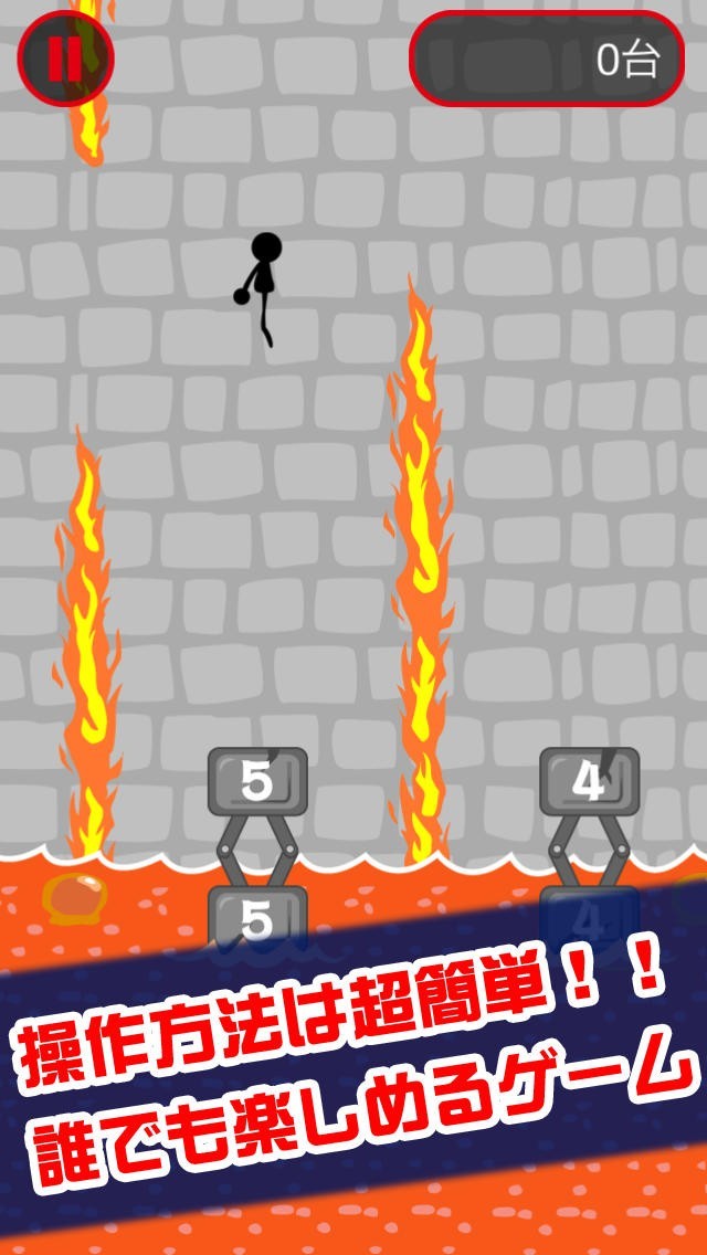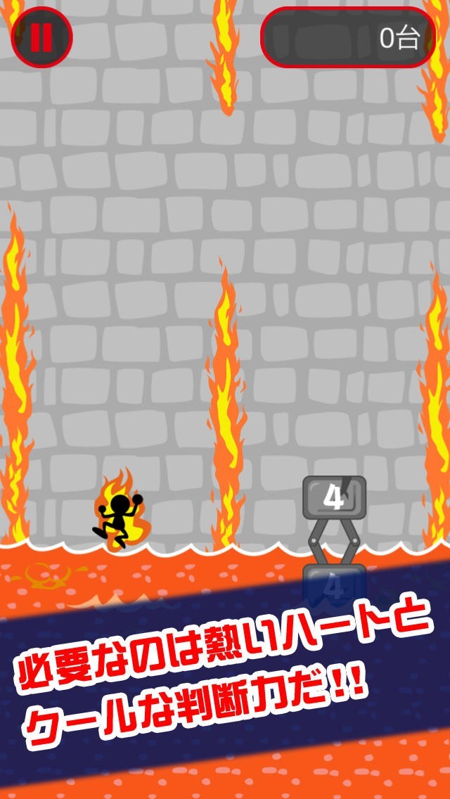 主人公の棒人間を操作し、タイミングよく火柱の間をくぐり抜けるゲームです。基本はジャンプ台に飛び移っていけばいいのですが、行く手を阻んでいるのが燃え盛る火柱です。火柱にはちょっとした隙間があいているので、その隙間目掛けてジャンプできるように、タイミングよくタップします。成功すれば台に乗ることができ、この動きの繰り返しになります。しかしゲームが進むに連れて火柱が上下に動くので難易度が上がります。冷静に火柱の動きを見極めて、確実にくぐり抜けましょう。