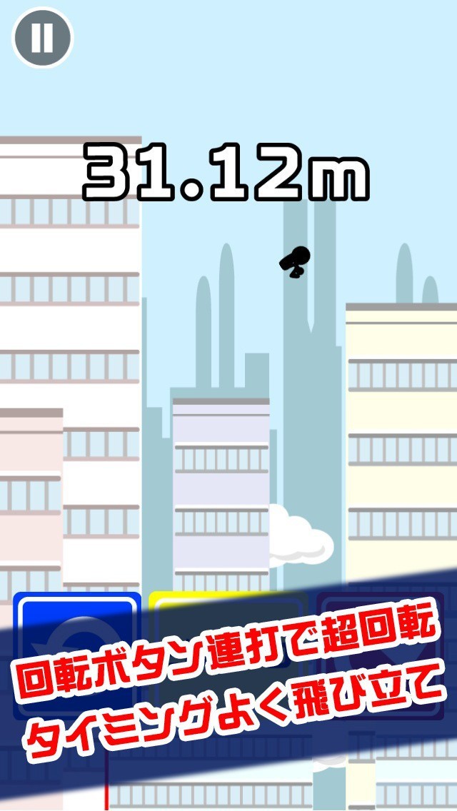 左右の回転ボタンをタップ連打で棒人間が回転。ジャンプボタンタップで思い切りよくジャンプ!