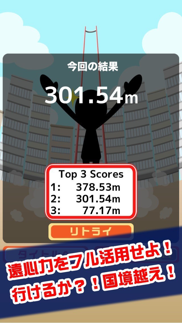 「鉄棒大車輪跳び」は、遠心力を活用してどこまで大車輪でどこまで飛べるかを競うカジュアルゲームです。 プレイヤーが操作するのは鉄棒から今まさにジャンプしようとしている棒人間。 左右の回転ボタンを連打して棒人間を回転させ、タイミングよくジャンプボタンをタップしましょう。 回転ボタンを連打するほどに棒人間が激しく回転。ハイスコアを狙うことができます。 ランキング機能を活用すれば友達をスコアを競い合える他、今回の結果と併せて歴代スコアTOP3が表示されるなど、思わず夢中になってしまう要素も満載です。