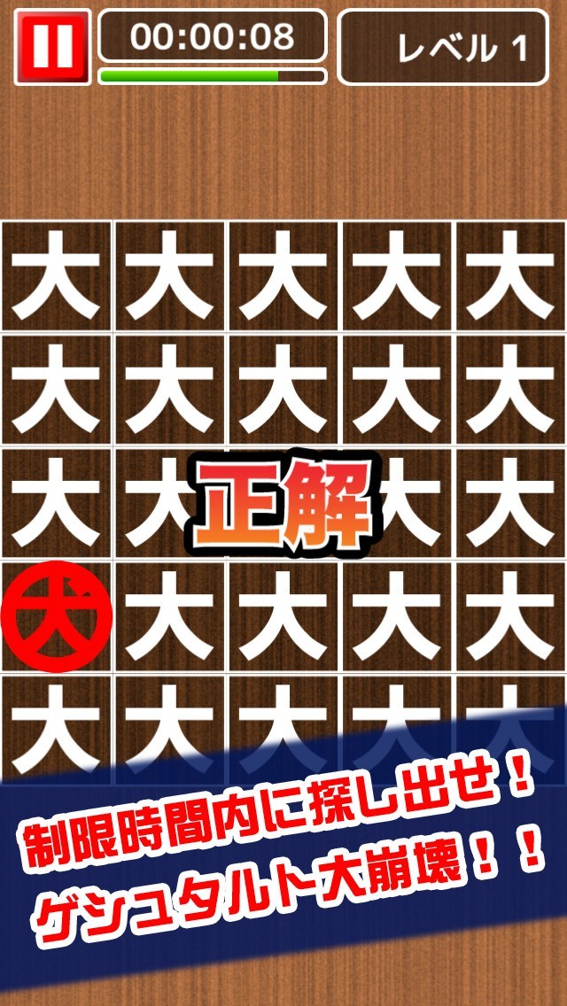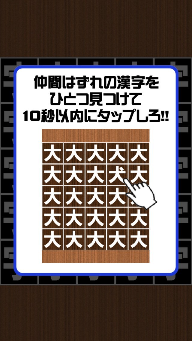 1つだけ紛れ込んだ違う漢字を見つけるというシンプルなゲーム
