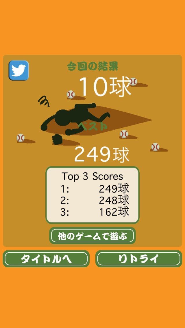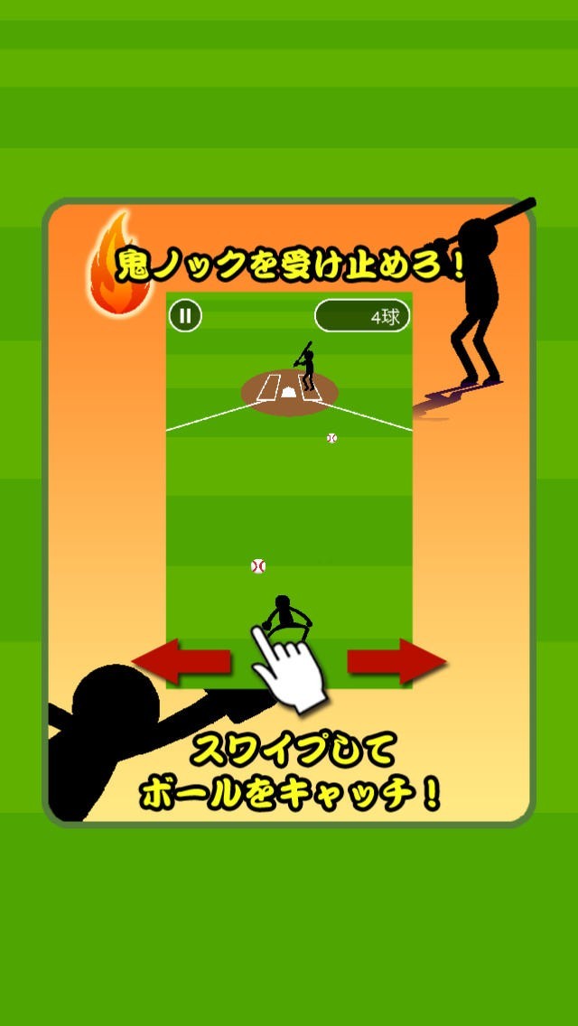 どんどん飛んでくる野球のボールをキャッチしていくノックゲームです。操作キャラをスワイプで左右に動かしてボールに合わせるようにしていきましょう。一度でもキャッチに失敗すると即ゲームオーバーなシビアな難易度になっています。