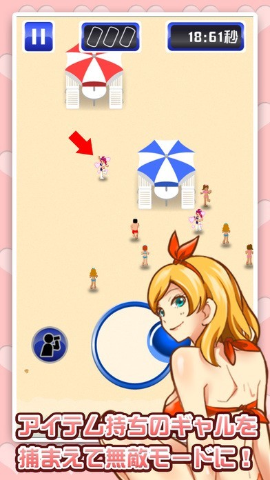 水着ギャルと鬼ごっこして捕まらないように逃げ回るゲームです。画面に表示されているレバーを動かすことで逃げます。鬼の水着ギャルは時間経過と共に徐々に増えていくので難易度が上がっていきます。逃げ切れたタイムで競います。 アイテムちゃんを捕まえればエナジードリンクが手に入り、ボタンをタップしてエナジードリンクを発動させると一定時間無敵状態になります。鬼に捕まらないのはもちろん、鬼に触れると弾き飛ばして排除することができます。
