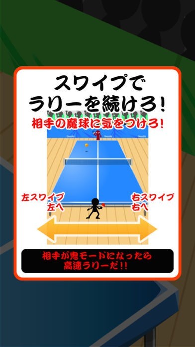 鬼ピンポンは、スワイプでラリーを続けていくスポーツをしている気分になれるゲームです。ピンポン球が飛んでくる方向にスワイプします。人間を移動させることで、自動的に球を打ち返すことができます。打ち返せなかった時はゲームオーバーになります。残像機能があり、ラリーの途中で球が2つになることがあります。濃い色の球が本物の球なので、間違えないように気を付けてスワイプするのが攻略法です。球を打ち返していく単純なゲームですが、球が2つに見えたり速度が速くなります。 ラリーが続くと、相手が燃えて鬼になります。球が魔球となって突然速くなります。素早く的確にスワイプを操作させるのが楽しく、ストレス解消にもなります。