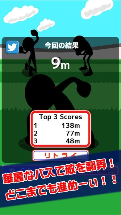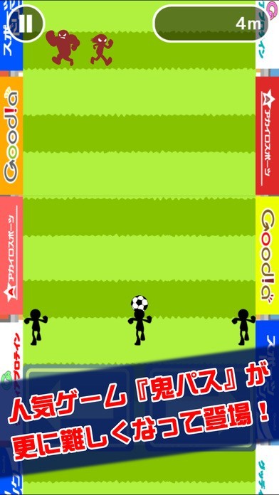 鬼パスⅡは、サッカーのドリブルを3人で行い、敵にボールを取られないようにパスを続けるゲームです。画面は縦スクロールで進んでいきます。操作は2つのボタンなので、初心者でも簡単です。右矢印をタップすると右へ、左矢印をタップすると左へパスをすることができます。敵にボールが渡るとゲームオーバーになりますが、何度もチャレンジできます。世界ランキング機能では、世界中の人たちと距離を競うことができます。世界順位がわかって励みになります。 パスが続くと鬼マークがでてきます。ゲットできると、一定時間は無敵状態になり素早く進むことが可能です。スピード感があり、達成感も味わうことができるゲームです。