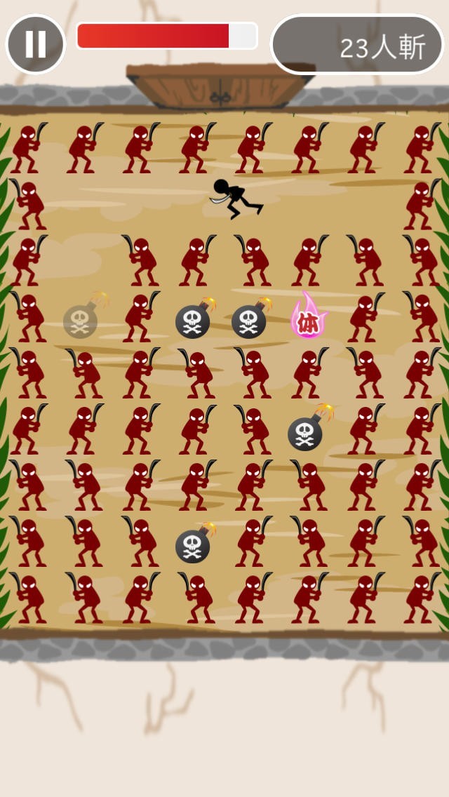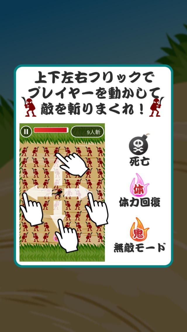 大量に現れる敵を斬りまくるカジュアルゲーム「鬼斬り」 画面にはライフメーターが表示され、メーターが無くなるまでひたすら切りまくる爽快感を味わることができます。 上下左右にフリックして主人公の移動を操作。 敵の群れに混じって出現する即死アイテムや爆弾アイテムに触れてしまうとゲームオーバーになるため、タイミングよく避けながら操作を行いましょう。 鬼アイテムを獲得すれば、必殺スキルの発動で大量の敵を斬ることができます。 GameCenterとの連携も可能。世界ランキングに挑戦して各国のプレイヤーと順位を競い合えるようになっています。