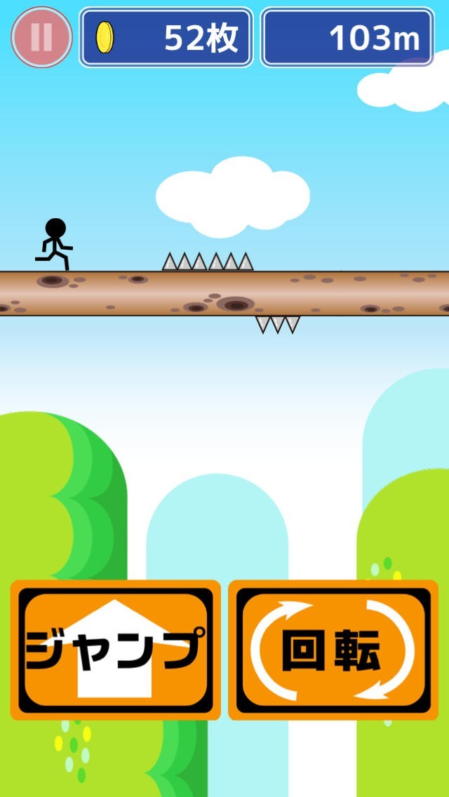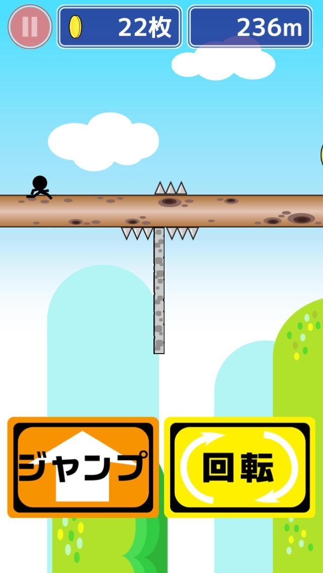 棒人間達を操作してトゲトゲを回避するカジュアルゲーム「トゲトゲ棒渡り」 棒の上に設置されている障害を避けながら、できるだけ長い距離を走りましょう。 画面下部にはジャンプボタンと回転ボタンを設置。 障害に合わせて素早くタップすることで、危険を回避できるようになっています。 プレイ後にはリザルト画面が表示され、トップ3スコアや今回の結果を表示可能。 GameCenterとの連携機能も充実しており、世界のユーザーとスコアを競い合って遊べるのも特徴です。