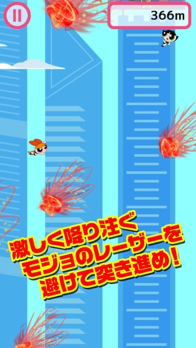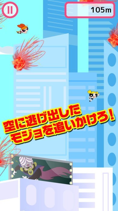 ここはお馴染みタウンズヴィル。パワーパフ ガールズの最大の敵「モジョ・ジョジョ」がまた悪さをしたので、ブロッサムが緊急出動!空に逃げ出したモジョを追いかけろ!ブロッサムをタップで操作して、激しく降り注ぐモジョのレーザーを避けて突き進め!君はどこまで追いかけることができるかな?