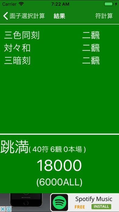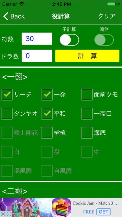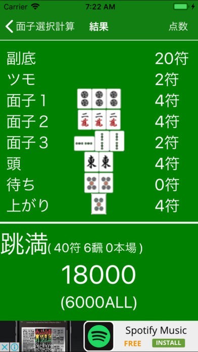上がり役・面子を選択するだけで点数や符を計算・結果を表示してくれます。