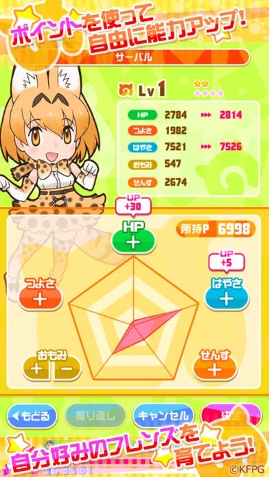 けものフレンズに登場する多数の人気キャラクターたちの中から好きなキャラクターを集めて、伸ばしたいステータスを選んで自由に育成をすることが出来るようになっています。