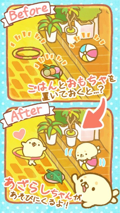 「ウチのあざらしちゃん」は、海辺のカフェに遊びに来るあざらしちゃんを眺めて癒されるゲームアプリです。あざらしちゃんの好物を用意しておけば、様々なタイプのあざらしちゃんが遊びに来てくれます。おもちゃで一生懸命遊んでいる姿はとてもかわいいです。時折レアなあざらしちゃんが出現することもあります!そんな時はチャンスを逃さず記念撮影に持ち込んでみましょう。ほかのプレイヤーからうらやましがられるような素敵な写真が撮れるかもしれません。