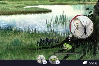 チョウやトンボなどの虫やカエルを捕まえたり、生き物たちの隠れ家を発見すると達成度がアップ。「カエルのパズル」に1ピースずつ「小さいカエルの絵」が配置されていき、達成度が100%になるとパズルが完成します。