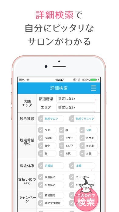住んでいる地域や受けたい施術の内容などによって脱毛サロンを検索可能!
