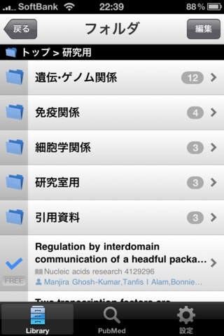 App Storeより引用PubMed Clipは学術文献検索サービスPubMedを検索し、文献情報を手軽に管理するためのアプリケーションです。