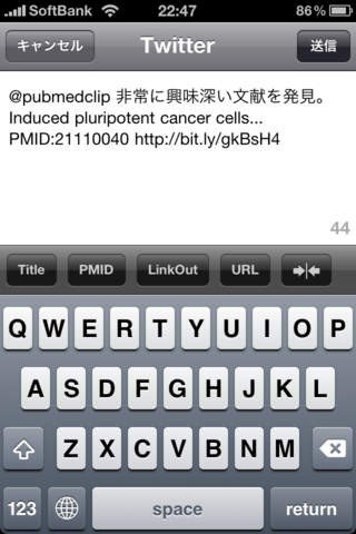 PubMed ClipからTwitterへつぶやきを送信することができます。投稿フォームには、文献のPMIDやタイトル、リンクなどを挿入するためのボタンを用意していますので、ストレスなく投稿することができます。URL短縮もサポートしています。