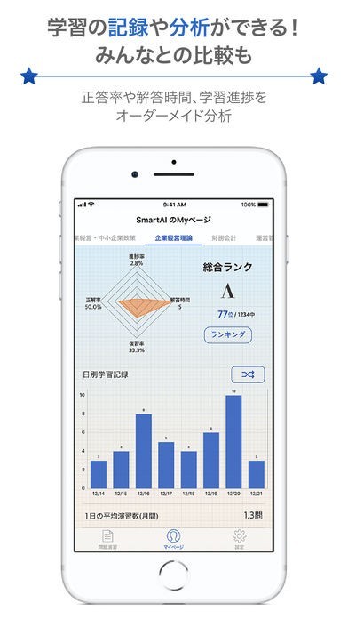 他のユーザーと成績を比較して全体のランキングを確認したり、平均正解率や平均回答時間、間違えやすい問題などを確認することができます。ユーザーと比較することでやる気が起き、合格を目指して学習を進められます。