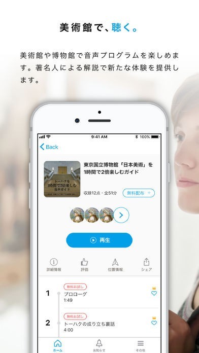 専門的な知識のある人を中心に案内ボイスが吹き込まれているので、正しく豊かな情報で楽しめます。旅行で地域を歩いたり芸術鑑賞など目的に合わせた専用案内のトラックを好きに聞けます。