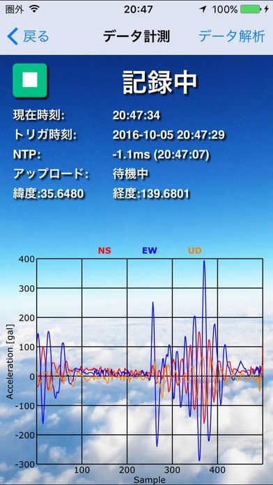 i地震はiPhoneに搭載されている加速度センサーを利用して,あなたが設定した加速度レベルを超えた振動を,100分の1秒毎に正確なタイムスタンプ付きデータとして記録します.時刻は外部のNTPサーバーと同期させています.