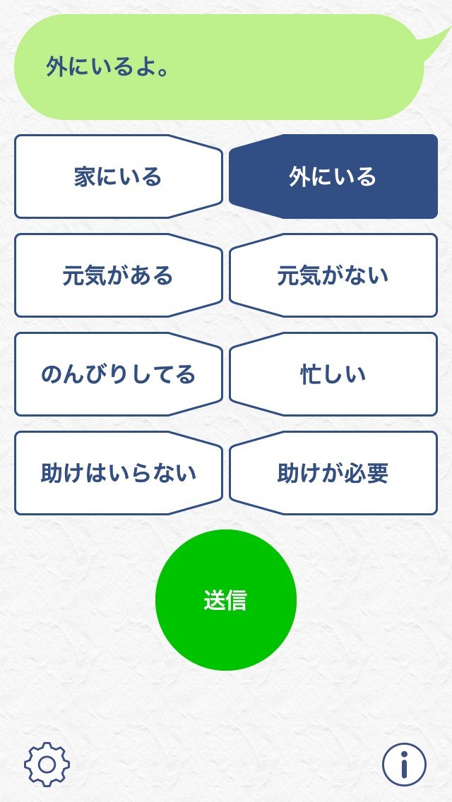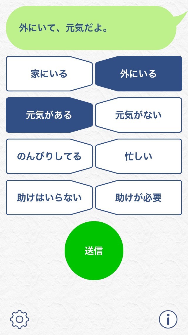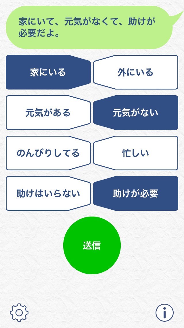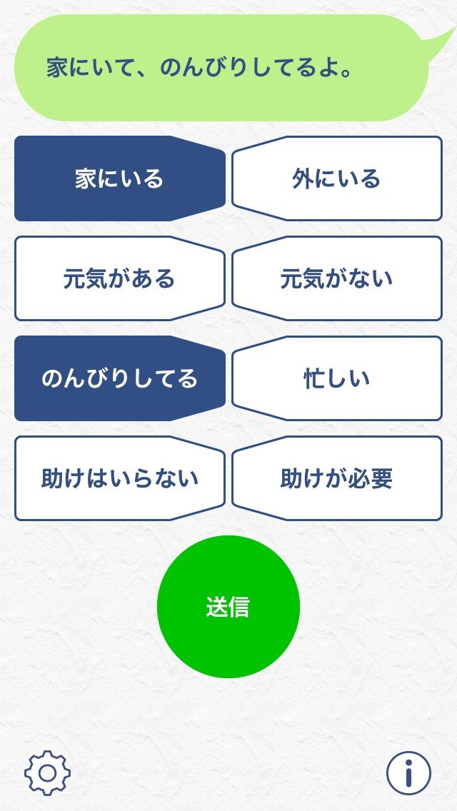このアプリはスマートフォンの操作を理解することが難しいお年寄りの方や障がい者の方のために8つのボタンをタップするだけで80種類のメッセージで意思表示することが出来るようになります。 さらには送信先を設定しておくことで、そのような手間もかからずにすみます。 ボタンは、「家にいる」、「外にいる」、「元気がある」、「元気がない」、「のんびりしている」、「忙しい」、「助けはいらない」、「助けが必要」のみで、複数選択することによって、現在の細かな状況まで伝えることが可能となります。