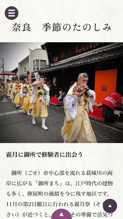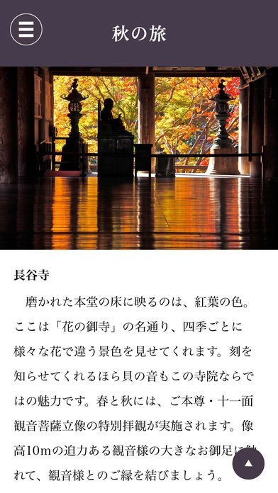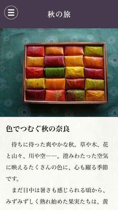 1300年以上の時を経て、悠久の歴史と文化が息づく古都・奈良。日本のはじまり、古代から残る神社や仏閣、祭礼と行事など、訪れたい名所旧跡は数知れません。さらに、季節のかすかな変化を感じることができる天然の食の楽しみにも恵まれています。万葉集に謡われた豊かな風景の中で、長らく大切に伝えられてきた国宝・重文の数々や日本文化に出会う体験ができる土地、それが奈良です。その魅力を深く理解し、季節を大切に感じながら旅するためのモバイルアプリケーションです。メインページ(トップページ)では、約5日ごとにコンテンツを更新し、旬の旅情報をお届けしていきます。また、奈良の春・夏・秋・冬の各季節におすすめの旅を提案する「四季の旅」コンテンツも掲載しています。ぜひモバイル片手に奈良を発見する旅へ。