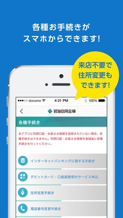 碧海信用金庫の公式アプリとして、残高照会機能などを用意しています。支店やATMに出向かなくても自宅や外出先で手軽に口座残金の確認が可能。インターネットバンキング申し込みなどもアプリから行えます。