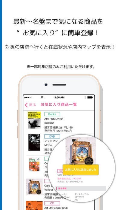 目玉機能②最新の人気曲から懐かしの名盤まで、気になる商品をお気に入り登録できます!対象の店舗内では、気になる商品の在庫状況お知らせ機能が使えます。