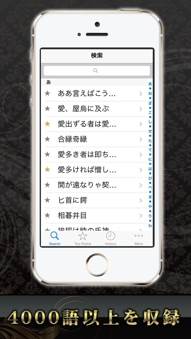 App Storeより引用あなたはこの辞書を使って、4000語以上の諺を調べる事が出来ます。