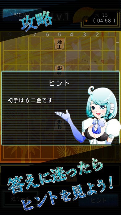 行き詰まったときは、迷わずヒントに頼ってみましょう。詰将棋で大事なのは数を多くこなすこと。定石をしっかり覚えれば、上級者レベルのクリアだって難しくはありません。