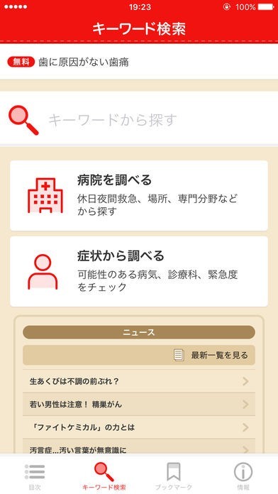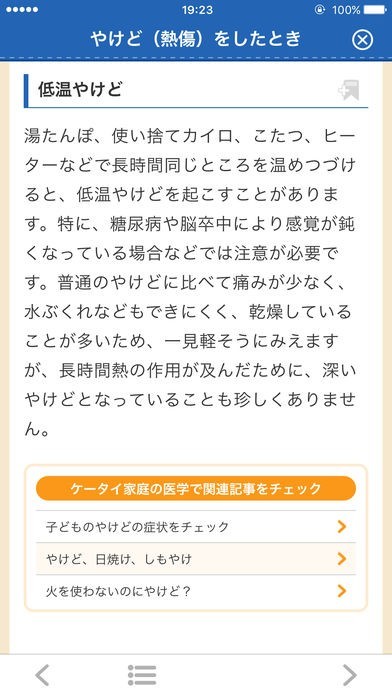 外出先で怪我をした場合にどうするのか?その場でどう対応するのか、更に詳しいケータイ家庭の医学と連携して正しい知識を学べる