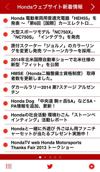 自動車メーカーHondaの最新情報を閲覧できるアプリです。ウェブサイト・四輪・二輪・汎用製品・プレゼントの各項目が用意されていて、左右にスライドさせて選択できます。気になる見出しがあったらクリックすれば見出し全文を見ることができ、矢印をクリックすると本文を読むことができます。 Honda製品のニュースやF1の情報などを画像付きの分かりやすい文章で知ることができます。読んだニュースの見出しは薄く表示されるので、既読と未読が一目で分かります。
