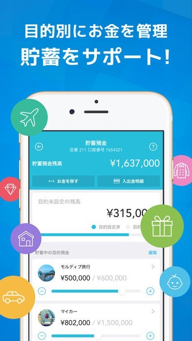 アプリに登録すれば簡単に残高を確認することができます。また、目標別に貯蓄もできます。