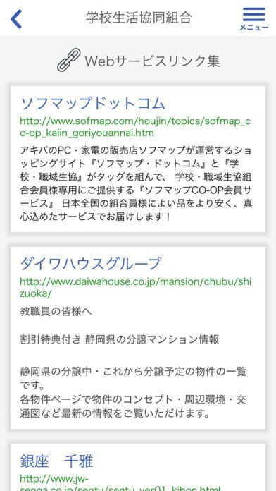 組合員証の表示の他に、Web サービスリンク集、指定店・契約指定店のご紹介、お得なデジタルクーポンのご提供など、多彩なコンテンツもございます。