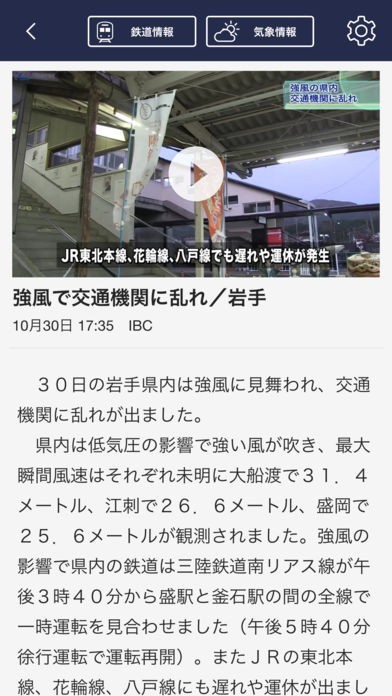 岩手県内のニュースを確認できるこのアプリには、鉄道情報も掲載されています。鉄道情報から普段利用する鉄道を登録することで、運行状況をプッシュ通知で教えてくれます。