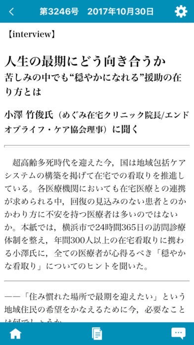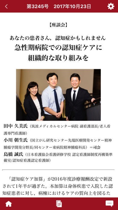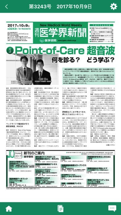 「週刊医学界新聞 for iPhone」アプリでは、医師や看護師に向けた最新の医学情報を配信しております。週間医学界新聞は50年にも及び、最新医学情報を提供してきました。その為、医師や看護師からの信頼は高く、現在でも医学界に大きな影響を与えています。このアプリでは、医師・医学生・看護師と3つの分野に分けて情報を配信しております。どの分野の情報も大変役立つものばかりで、勉強熱心な医学生には多大な影響を与えている事でしょう。医学の発達に大変役立つアプリなのです。