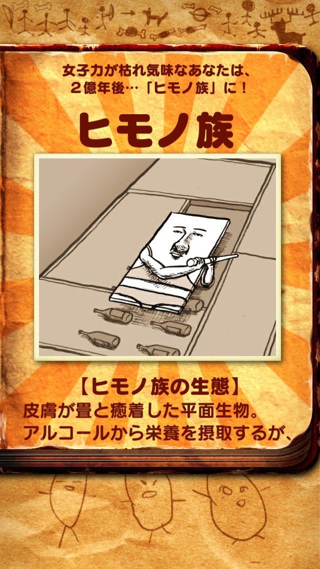 天変地異により孤立した状態で独自の進化を遂げた2億年後の日本に、どのような日本人が生息しているかを予測するゲームです。 まず3択5問の質問が提示され、それに解答することで、2億年後の日本であなたがどのような生態に進化しているかを診断します。 質問は日常的にありふれた内容で、選択肢もそれほど奇抜なものはありませんが、提示される診断結果はかなり突飛なものです。 個々人の性格や癖の特徴を際立たせただけとも言えますが、その程度が究極きわめたものなのです。 何度も診断を繰り返しさまざまな解答をすることで診断結果も増やせます。 1回の遊戯は数分程度で済むので、気楽なジョークゲームとして楽しめます。