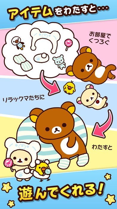 お店で買ったアイテムをリラックマたちに渡してみよう!アイテムによってリラックマたちの反応が変わるよ!