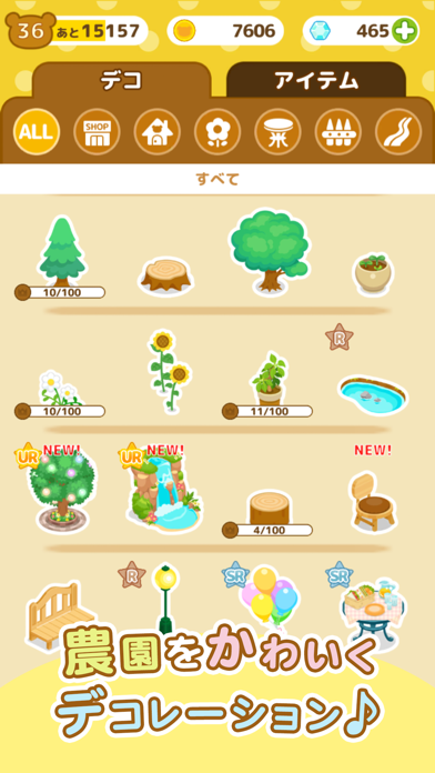 農園で様々な作物を育て、収穫して、組み合わせて、おやつや料理を作って出荷しましょう。ご近所からの注文にこたえると、農園を可愛く装飾できる、リラックマの世界観をイメージしたデコやアイテムがもらえます。オリジナリティ溢れる農園を自由に作り上げ、ユーザー同士でお披露目しましょう。