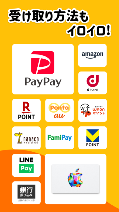(Amazonギフト券、楽天ポイント、Tポイント、dポイント、Pontaポイント、nanacoポイント、WAONポイント、iTunesギフトコード、銀行振込など)
