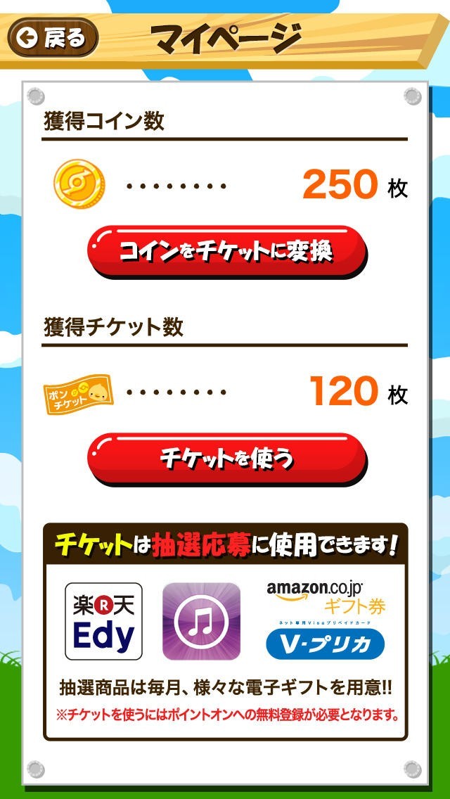 ゲームプレイで集めたコインは100枚貯めると商品抽選の応募チケット1枚と交換することができます。商品は様々な種類のものが取り揃えられているので、たくさんプレイして様々な商品の抽選に応募してみましょう。
