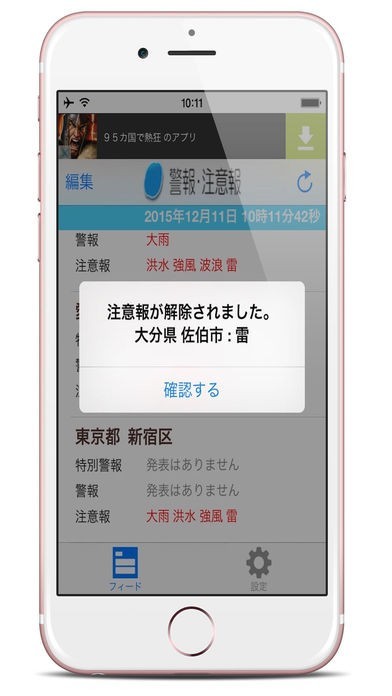 登録した市町村に警報・注意報が発表された場合、もしくは解除された場合ユーザーに通知でお知らせしてくれます。このアプリは気象庁の情報を元にしていますので正確で安心です。