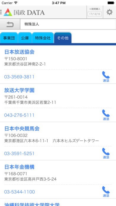 特殊法人や主要団体のデータを確認する事が可能で、電話番号や周辺エリアの宿泊地も調べられるようになっています。官公庁のHPに素早くアクセス出来るのも利点でしょう。