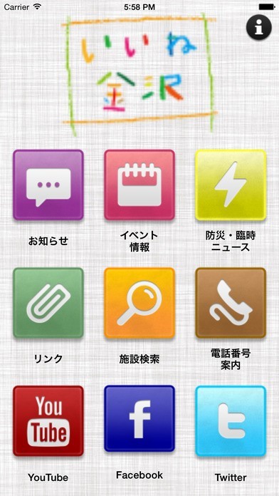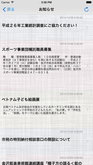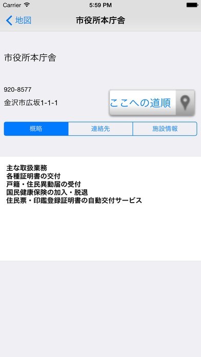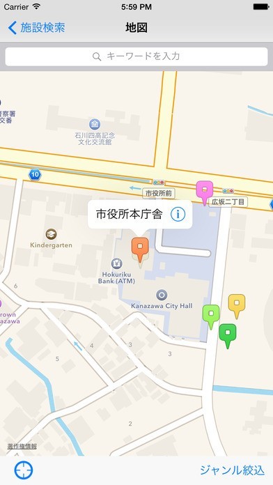 当アプリは、金沢市のお知らせやイベント情報などの各種新着情報の他、市有施設などの検索やルート案内等ができます。