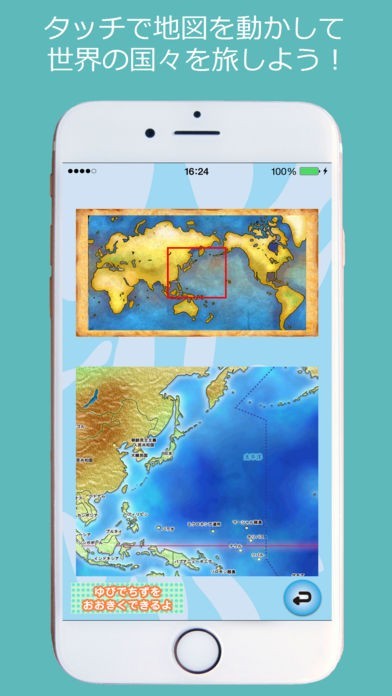 タッチ操作で地図を探険して、知りたい国や国旗を探してみましょう。拡大や縮小も可能です。目的の国を見つけたら、国旗や人口、言葉、国土の大きさなどを知ることができます。
