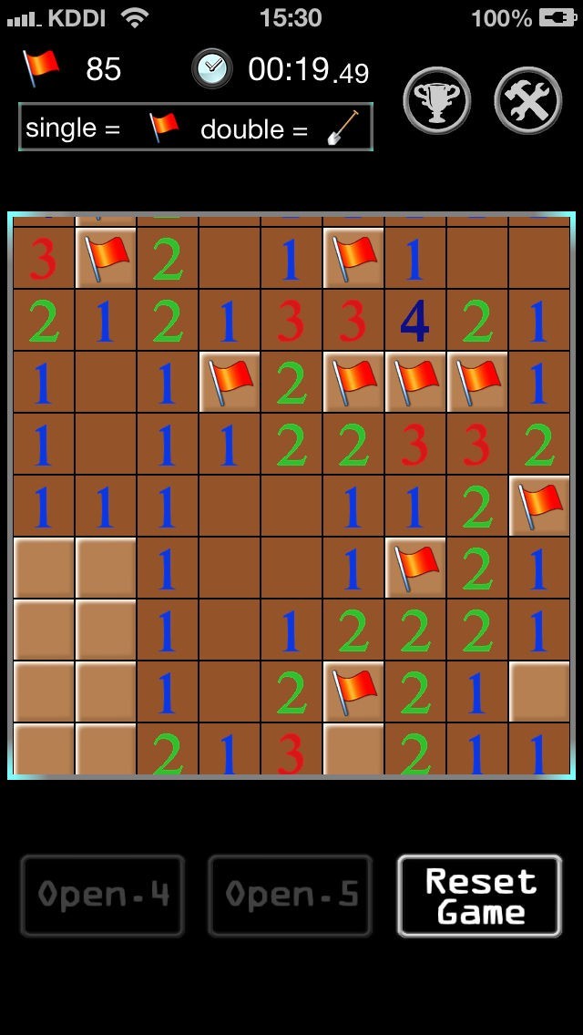 ・数字をタップすると数字と周りのフラグの数が等しければ、数字の周りをオープンします。